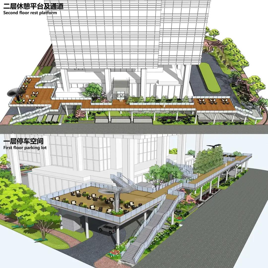 為了空間的集約有序,解決陸家嘴空間緊張的問題,未來二期改造還可以嘗試在地面一層設(shè)置停車場(chǎng),然后二層設(shè)置休閑平臺(tái),并且將二層休閑平臺(tái)與二層建筑形成接口,這樣既解決了陸家嘴空間緊張沒有公共空間的問題,同時(shí)也解決了停車難的問題。