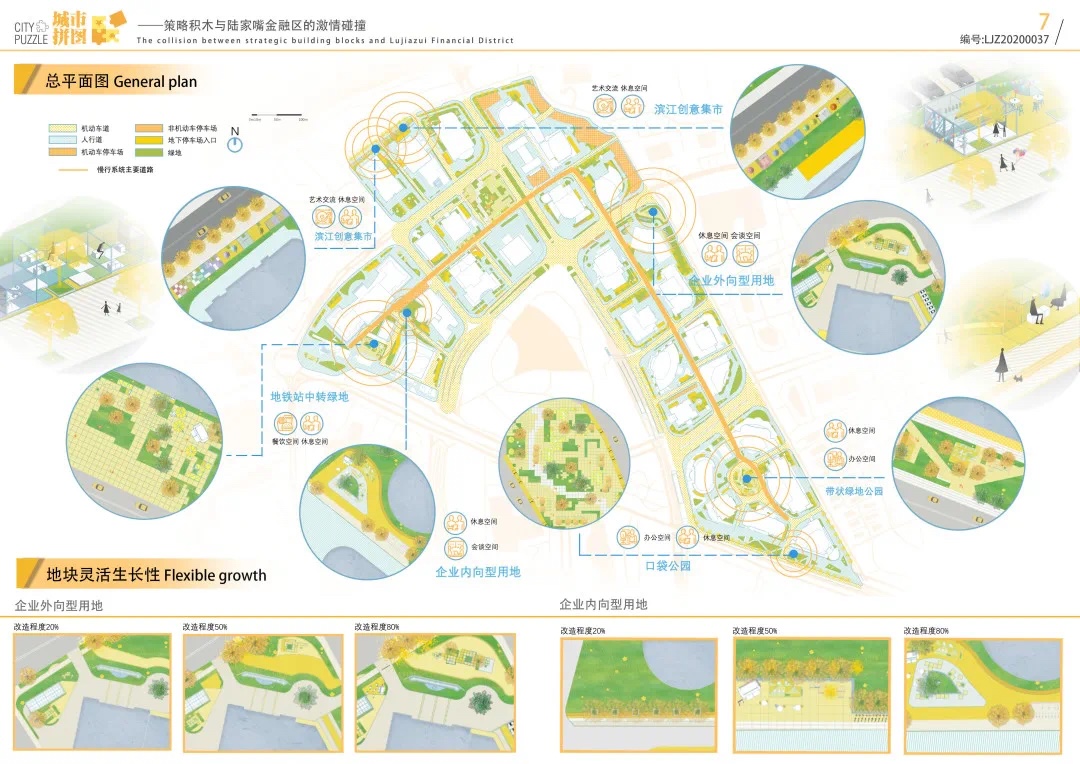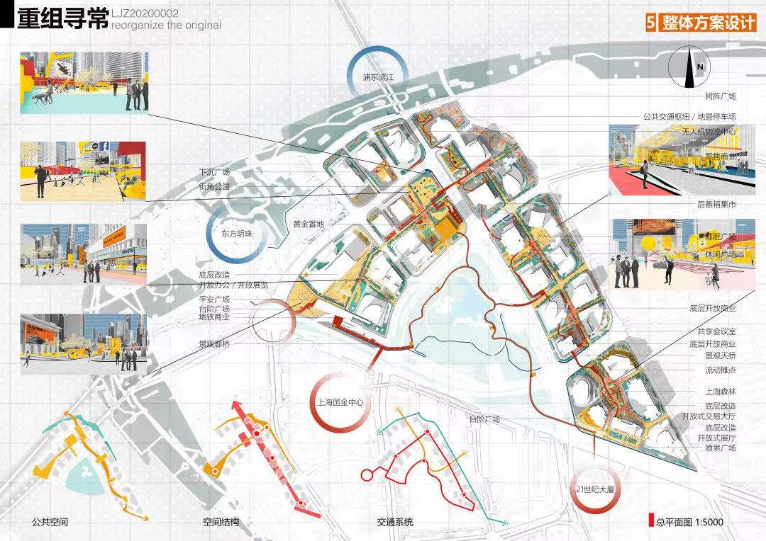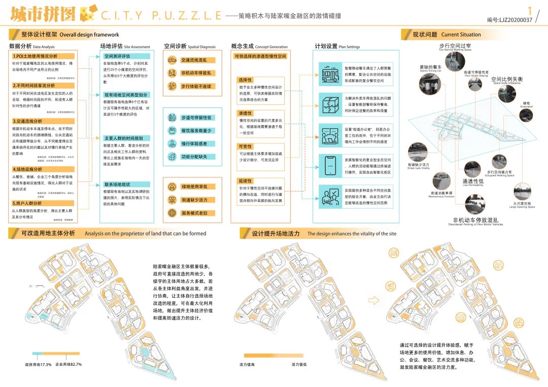 方案設計說明:本方案以基于數(shù)據(jù)實時反饋的自主街區(qū)為主題,通過構建自主交通、自主活力和自主城市大腦三大系統(tǒng),引入膠囊巴士、交通管理系統(tǒng)、智能可變鋪裝、智能活力細胞、底層分時開放、城市大腦和信息共享平臺,以提升該地區(qū)的空間活力;系統(tǒng)的運轉基于場地的時空需求進行實時調(diào)整,進行可持續(xù)的漸進式更新。
