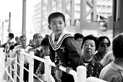 雖然世博會(huì)紀(jì)念展昨天中年12時(shí)才向公眾開放,但早上五六點(diǎn)鐘,就有市民前往排隊(duì)。5時(shí)45分,從建德花園趕來的薛金芳阿姨成為排在第一位的參觀者。她帶上了世博期間曾陪伴她參觀了20多次的折疊小板凳,穿上了世博T恤衫,頗有去年參觀世博會(huì)的架勢(shì)。到9時(shí)30分,紀(jì)念展現(xiàn)場(chǎng)已有近50名參觀者等候。