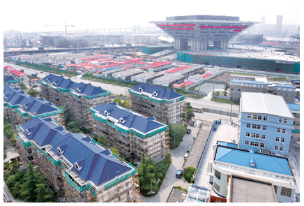 ??? 據(jù)浦東時報記者張琪6月9日報道:今天,距離上海世博會開幕還有326天。此時,中國館的“冠蓋”已描好最上面兩圈“中國紅”,更為壯觀的是,周邊的居民樓大部分已戴上“海洋藍”色的“帽子”——一片“海洋藍”托起一葉“中國紅”,成為俯瞰上海的新地標。