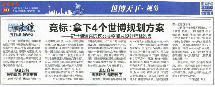 4年前,浦東建筑設(shè)計研究院有限公司的林選泉就與妻子結(jié)下了百年之好,然而,夫妻倆新婚燕爾,便雙雙投入世博規(guī)劃方案競標(biāo),先后在4個項目中折桂,林選泉還擔(dān)任了浦東園區(qū)場地公共空間的總設(shè)計師,帶領(lǐng)妻子和其他團(tuán)隊同仁全身心撲在世博會上。