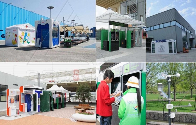 世博園區(qū)內(nèi)廢物箱分為:固定分類廢物箱、可移動(dòng)大容量分類廢物箱。另外在世博軸兩側(cè)永久展館區(qū)設(shè)置了先進(jìn)的氣體輸送垃圾系統(tǒng),采用半地下室建筑,建筑面積約1500 平方米,共計(jì)有53 個(gè)智能化垃圾投放口,每天能夠收集生活垃圾60t。