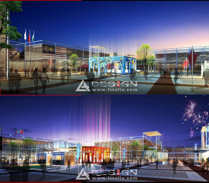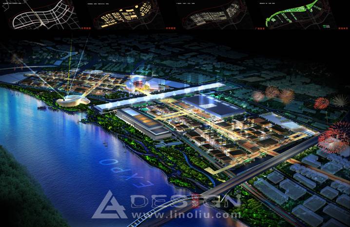 世博園區(qū)夜景照明主題分區(qū)設(shè)計、夜景照明色彩分區(qū)設(shè)計、夜景照明空間與時間手法、綠色照明設(shè)計、燈具選型、燈具布置等。