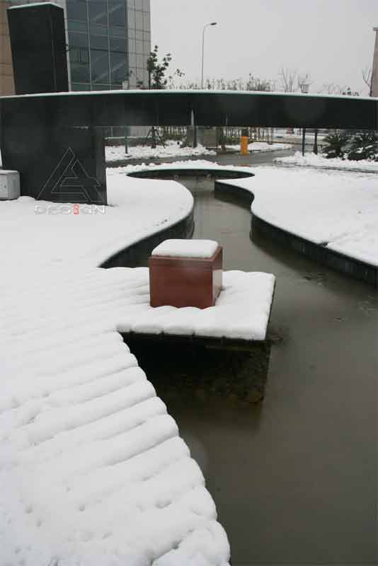planted, which suggests elegance and tranquillity. Ting-steps built in water, planting pools and rest platforms extending towards to water and small red square stools on the recreation platforms provide a small flexible space, so you can sit close by a window of office to enjoy the peaceful moment lonely of the afternoon. The breeze passes through the bamboo forest to blow small wavelets beside the pebbles. Because of the water, the space is parted but not separated; voices keep a distance while people converse and walk outside the window, and fish move freely in water, so the site has natural delight at that moment.