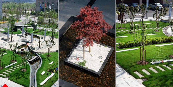 The project carried out formerly is a first-stage comprehensive matched service base which faces roads externally. An L-shaped main office building divides the space into an eastern part and a western part; the main entrance landscape space in the east and the roof garden landscape space of the underground garage in the west. For ensuring the integrity of the space, space is related by continuous water with variable forms and black and white pavements, while small spaces are alternated in the space by the landscape elements, such as plants, micro-landforms and small arch bridges, curves and a circular composition method to create order and activity within the environment.