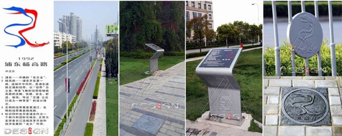在其中的附屬設(shè)施體系中,我們創(chuàng)新性提出為楊高路創(chuàng)立“楊高路標(biāo)識(shí)”。國(guó)內(nèi)能為一條道路專(zhuān)門(mén)設(shè)計(jì)一個(gè)標(biāo)志的情況不多,為城市主干道設(shè)計(jì)標(biāo)識(shí),目前在上海還是首次。針對(duì)楊高路的內(nèi)涵和個(gè)性設(shè)計(jì)了7個(gè)方案,通過(guò)新區(qū)領(lǐng)導(dǎo)和公眾參與的方式確立楊高路標(biāo)識(shí) “楊高路東方龍”方案。楊高路標(biāo)識(shí)提升了道路的形象與地位,公眾參與的過(guò)程強(qiáng)化了大眾對(duì)楊高路的認(rèn)知,提升楊高路的市容景觀,增強(qiáng)其文化品味,體現(xiàn)其自身特色。