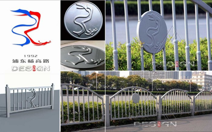 確定后的楊高路標(biāo)識(shí)運(yùn)用在道路附屬設(shè)施體系中,如道路隔離欄、人行道鋪裝等。并在楊高路人流大的(易初蓮花、東方藝術(shù)中心等)的重要節(jié)點(diǎn)設(shè)立“楊高路標(biāo)識(shí)創(chuàng)意說(shuō)明牌”,讓城市大眾解讀楊高路標(biāo)識(shí)的文化與含意,在詮釋中加深楊高路道路文化的認(rèn)同。