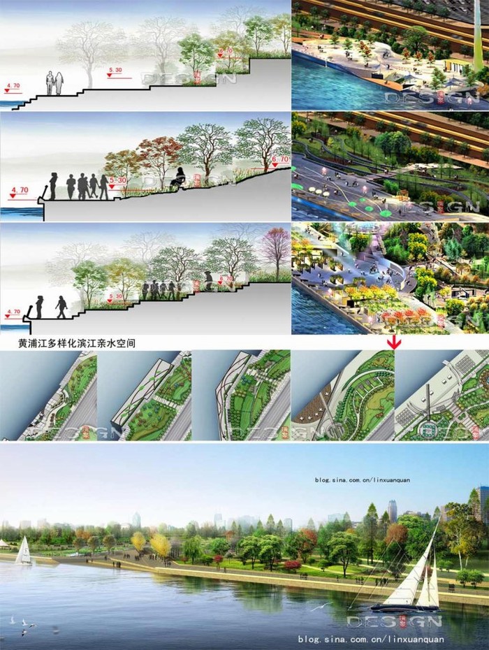 (3)濱江步道:在4.7m最高通航水位處,將4米寬的濱江步道設(shè)在這個(gè)標(biāo)高上,并貫通整個(gè)濱水區(qū)域。