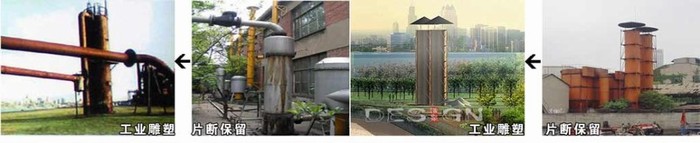 場(chǎng)地中由于原工業(yè)基地的特征,常具有些極具特征的工業(yè)構(gòu)筑物,如工業(yè)時(shí)代的大煙囪、變電站里的一些工業(yè)構(gòu)件等可以保留,經(jīng)過(guò)藝術(shù)加工成工業(yè)雕塑。