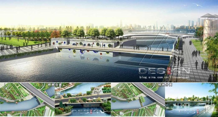 也是極具挑戰(zhàn)性。這就需要將“水工技術(shù)與景觀藝術(shù)”進(jìn)行完美結(jié)合。按照規(guī)劃白蓮涇河口處需建節(jié)制閘與二級(jí)泵站各一座,從景觀和工程統(tǒng)一角度考慮采用“泵閘合建”型式以減少占地,為了解決好泵閘建筑物體積較大的矛盾,泵閘采用單側(cè)布置方案,節(jié)制閘采用隱蔽的下臥門方式,泵房的外壁運(yùn)用圓形抽象圖案裝飾,削弱其混泥土的呆笨感,泵閘頂部結(jié)合綠化設(shè)計(jì)成可上人的觀光平臺(tái),泵閘的檢修橋通過(guò)藝術(shù)處理成為連接白蓮涇兩岸的步行橋。通過(guò)技術(shù)與藝術(shù)的融合讓泵閘最大限度地與周邊環(huán)境相協(xié)調(diào),并成為濱水景觀中一景。