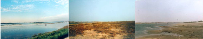 河灘: 松花江大橋橋址河道形成洲灘和島嶼(河套),是由細(xì)沙組成,色彩以土黃色為主,中明度、中純度。