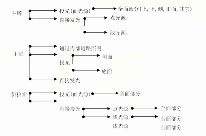 橋梁各個(gè)部分照明表現(xiàn)不同特性與內(nèi)容,但其照明效果應(yīng)具整體性。