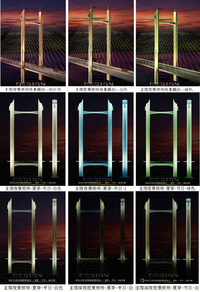 5-2-3-6? 時(shí)間手法: 在不同的時(shí)間段,用不同的空間手法組合進(jìn)行色彩變化,創(chuàng)造富于變化的橋梁夜景,這些場(chǎng)景變化根據(jù)季節(jié)、節(jié)假日、平日而變。甚至精確到一天時(shí)間的黃昏、夜晚和深夜這些時(shí)間段。