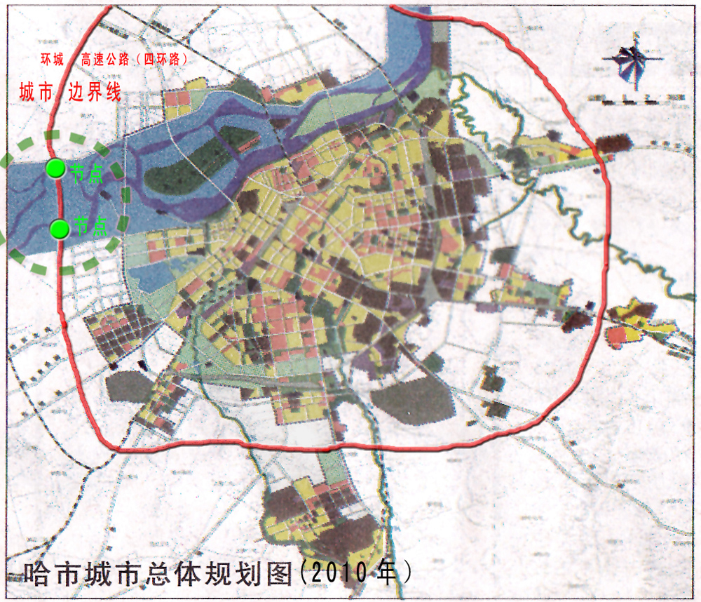 Lynch在《城市的意象》認(rèn)為,邊界是線型要素,屬城市、地區(qū)或鄰里之分界線,路能成為邊界,從這個(gè)角度上看。哈爾濱環(huán)城高速公路是哈爾濱的界線,而松花江大橋是這一“界線”的“節(jié)點(diǎn)”。( 見(jiàn)圖1)