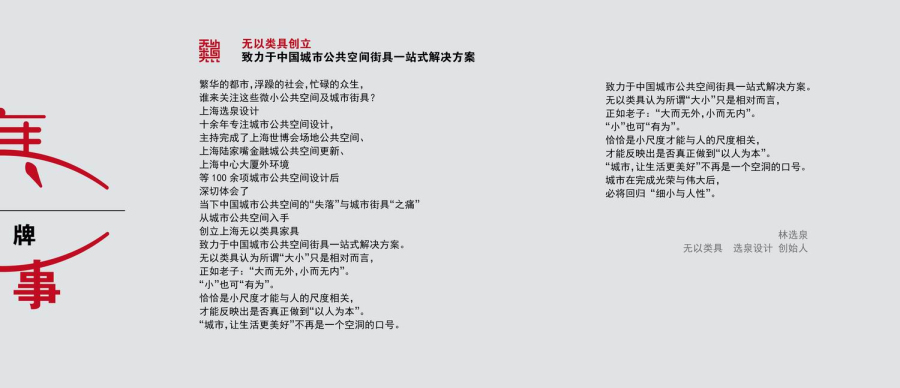 公司由2010上海榜樣人物、上海世博會(huì)場(chǎng)地公共空間總設(shè)計(jì)師林選泉與同濟(jì)大學(xué)建筑城規(guī)學(xué)院博士、美國Umass研究學(xué)者劉月琴共同創(chuàng)立。融合風(fēng)景建筑及工業(yè)設(shè)計(jì)專業(yè),以城市開放性公共空間設(shè)計(jì)為核心,以城市街具策劃設(shè)計(jì)制造一站式解決方案為特色。