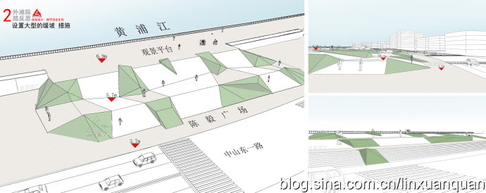 ??????回過頭來,看看外灘,因為外灘本身存在千年一遇的防洪堤而形成的防汛空箱,對于中山東一路的道路標(biāo)高為3.7m,而箱頂標(biāo)高為6.9m,存在3.2m的高差,因此從陳毅廣場到觀景平臺有高差,需要設(shè)置人流聚散的轉(zhuǎn)換空間(圖1)。因此就設(shè)計本身而言,我們認(rèn)為可以有下面幾點對策: