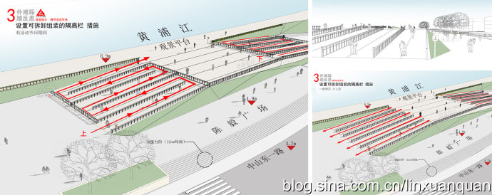 ?????如果出現(xiàn)超高密度人流,人流無序出現(xiàn)在緩坡的情況,可以在坡道上根據(jù)人流大小合理設(shè)置多道(依據(jù)人流通過斷面分析)分流的欄桿,上海世博會經(jīng)驗是將排隊區(qū)1列的寬度集約到0.8-1.2米寬。而且這種欄桿不能采用布條的“軟隔離欄”,需要采用市政的“硬隔離欄”,欄桿端部可活動調(diào)節(jié),欄桿基礎(chǔ)采用可插入式,欄桿本身可以拆卸組裝,在平日人流量不多的時候,可以全部移除或者間隔移除隔離欄,如果保留隔離欄,人流可以在寬敞的隔離欄桿間的空間可以自由的上下,而一遇到節(jié)假日或是節(jié)日活動,調(diào)節(jié)移動端部欄桿,封閉中間的欄桿端部通道,只留一個進(jìn)出的口,利用交警輔助引導(dǎo)人流(圖3)。同樣,也可以借鑒上海世博會最熱門沙特館,面對8-9小時超長時間排隊,我們研究不下二十幾種的排隊方案:之字形,回字形、直線形,同時武警領(lǐng)隊,一個個千人方陣前進(jìn),遇到急事臨時要出隊可以領(lǐng)卡,卡的不同顏色代表不同功能[7]。回過頭來看外灘,一旦人流密集超過管理極限,就需要在坡道的欄桿群里預(yù)先設(shè)置一條緊急通道,就像高速路上的快速撤離通道。如果這些通道在沒有事發(fā)的時候利用率低,且影響設(shè)計整體,那可以借用現(xiàn)有措施,比如通往觀景臺下的停車場的通道,我相信一般人不會去地下停車場逛的,所以它相對于景區(qū),人流量低,所以在未來,地下車庫的通道需要和應(yīng)急車道、外部空間整合,和景區(qū)整合,可以讓人從應(yīng)急通道中撤離,讓救護(hù)車第一時間到達(dá)事發(fā)地點。?