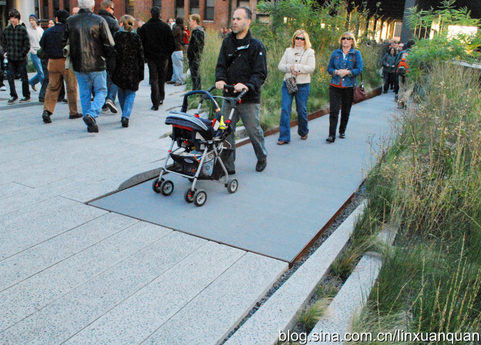 為了保留鐵軌的這種歷史記憶,Highline整體設(shè)計(jì)采用了豎線風(fēng)格,是對(duì)原來(lái)鐵軌豎線風(fēng)格的一種延續(xù)。而這種延續(xù)不僅是平面上同時(shí)其上的人性化設(shè)施包括坐凳,直飲水等設(shè)施,都采用了和豎線相協(xié)調(diào)的極簡(jiǎn)風(fēng)格。整體上采用了結(jié)合不同的小空間以及和不遠(yuǎn)處的哈德孫河進(jìn)行景觀上,空間上的呼應(yīng),因此也并不單調(diào)。