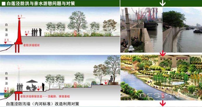世博白蓮涇河地區(qū)流淌著千年防洪標準的黃浦江和將作為內(nèi)河的白蓮涇,針對兩種不同類型濱江濱河帶,采取不同應對措施。