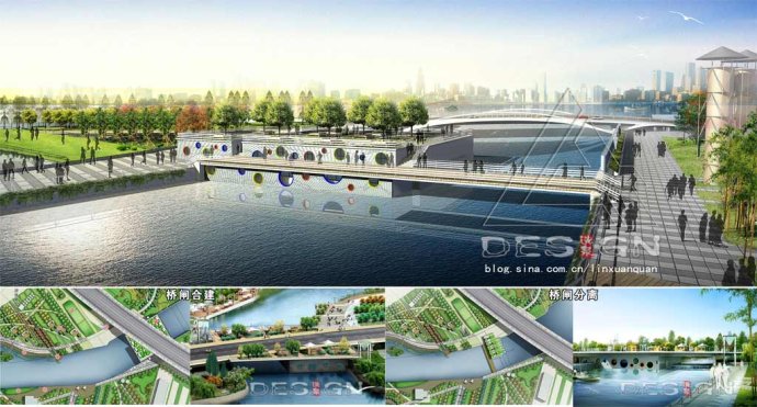 也是極具挑戰(zhàn)性。這就需要將“水工技術(shù)與景觀藝術(shù)”進行完美結(jié)合。按照規(guī)劃白蓮涇河口處需建節(jié)制閘與二級泵站各一座,從景觀和工程統(tǒng)一角度考慮采用“泵閘合建”型式以減少占地,為了解決好泵閘建筑物體積較大的矛盾,泵閘采用單側(cè)布置方案,節(jié)制閘采用隱蔽的下臥門方式,泵房的外壁運用圓形抽象圖案裝飾,削弱其混泥土的呆笨感,泵閘頂部結(jié)合綠化設(shè)計成可上人的觀光平臺,泵閘的檢修橋通過藝術(shù)處理成為連接白蓮涇兩岸的步行橋。通過技術(shù)與藝術(shù)的融合讓泵閘最大限度地與周邊環(huán)境相協(xié)調(diào),并成為濱水景觀中一景。
