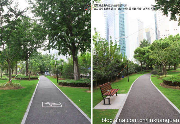 陸家嘴有大的中心綠地, 大但被寬闊道路阻隔,可達(dá)性差。