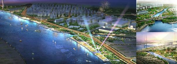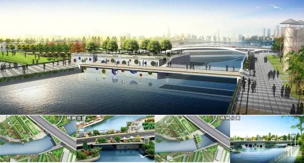 也是極具挑戰(zhàn)性。這就需要將“水工技術(shù)與景觀藝術(shù)”進(jìn)行完美結(jié)合。按照規(guī)劃白蓮涇河口處需建節(jié)制閘與二級(jí)泵站各一座,從景觀和工程統(tǒng)一角度考慮采用“泵閘合建”型式以減少占地,為了解決好泵閘建筑物體積較大的矛盾,泵閘采用單側(cè)布置方案,節(jié)制閘采用隱蔽的下臥門方式,泵房的外壁運(yùn)用圓形抽象圖案裝飾,削弱其混泥土的呆笨感,泵閘頂部結(jié)合綠化設(shè)計(jì)成可上人的觀光平臺(tái),泵閘的檢修橋通過藝術(shù)處理成為連接白蓮涇兩岸的步行橋。通過技術(shù)與藝術(shù)的融合讓泵閘最大限度地與周邊環(huán)境相協(xié)調(diào),并成為濱水景觀中一景。