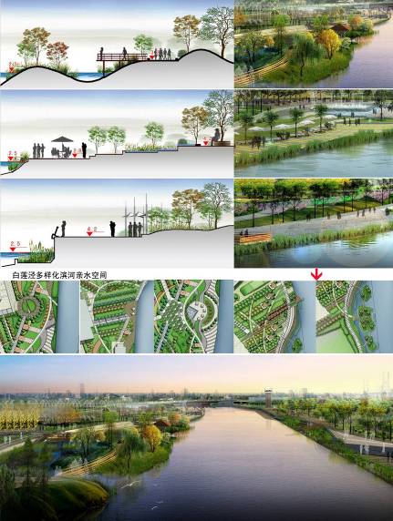 白蓮涇變?yōu)閮?nèi)河后,通過景觀策略可以實(shí)現(xiàn)濱河空間的親水與多樣,濱河駁岸的生態(tài)與自然型。具體措施如下(圖7):