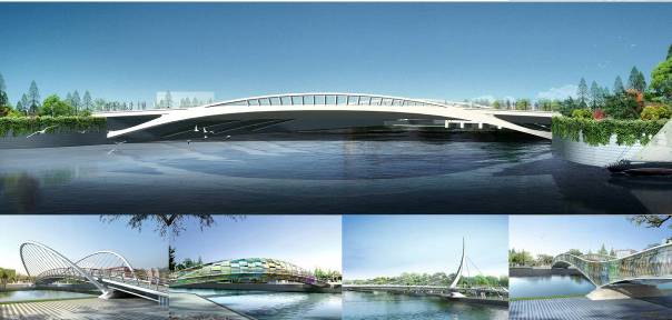 浦明路車行橋與白蓮涇人行橋設(shè)計(jì)(圖14)中引入“橋梁景觀CI理論”[5],在工程和景觀統(tǒng)一的前提下,優(yōu)選橋型,確定風(fēng)格。從整個(gè)世博園區(qū)和濱江輪廓線角度分析,白蓮涇河口處的浦明路橋無需標(biāo)志性,它需要“調(diào)和于環(huán)境”,橋型上最終選擇“三跨連續(xù)剛架拱橋”,同時(shí)處理好“橋梁
