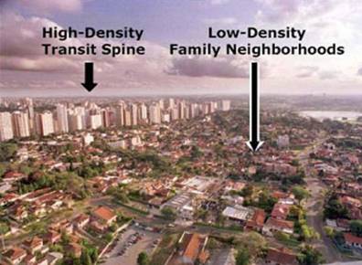 國(guó)外在實(shí)踐中,通過以下措施在生態(tài)城市建設(shè)方面取得了一定的成功:明確而具體現(xiàn)實(shí)的目標(biāo)體系、具體的項(xiàng)目、突出的重點(diǎn)領(lǐng)域、生態(tài)建設(shè)與城市建設(shè)的一體化推進(jìn)、詳細(xì)的分工實(shí)施體系、廣泛的公眾參與,加上具有明確法律地位和角色定位的推進(jìn)和實(shí)施機(jī)構(gòu)及完善的法律條例、市場(chǎng)化的管理體制等作為支撐條件[16]。如被認(rèn)為最接近生態(tài)城市的巴西庫里蒂巴市生態(tài)城市建設(shè)的成果經(jīng)驗(yàn)就可以概括為:①公交導(dǎo)向式的城市開發(fā)規(guī)劃(如圖12);②實(shí)行垃圾回收項(xiàng)目;③關(guān)注社會(huì)公益項(xiàng)目;④對(duì)市民進(jìn)行環(huán)境教育[17]。其中,城市沿著城市交通主軸向外發(fā)射發(fā)展,這些軸線的交匯點(diǎn)在城市中心區(qū),公交為導(dǎo)向的城市開發(fā)將所有的土地利用和開發(fā)密度進(jìn)行了分區(qū),5條軸向道路中的4條(即軟封閉的城市快速道路)旁邊地塊的容積率為6,而其他普通公交線路服務(wù)區(qū)的容積率為4,離公交線路越遠(yuǎn)的地塊容積率越低。庫里提巴市政府只允許距離公交線路旁2個(gè)街區(qū)進(jìn)行高密度開發(fā),并嚴(yán)格控制距公交線路2個(gè)街區(qū)外的建筑密度和高度,形成了以城市主干道為軸線的城市建筑階梯型向空中發(fā)展的模式[18]。
