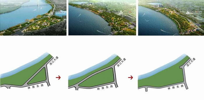 城市必然回歸到人本的思想,尊重人的游憩對空間的需求。將原來延伸到公園中的濱江大道取消,使之成為城市公園的一部分,并因此而增加了當(dāng)?shù)氐娘L(fēng)情建筑,老年運動場地。并且根據(jù)人的行為需求,大小空間穿插,即有老年人聚會的大廣場,又有休閑歇息的街巷小尺度空間。