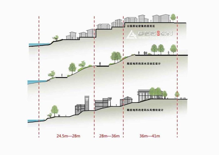盡管對于高差的處理,在城市化建設(shè)的過程中,水利工程師已經(jīng)用鋼筋鐵墻表達(dá)了“人定勝天”的精神力量。但是出于對道教文化的“無為”思想以及當(dāng)代的生態(tài)理念的推崇,針對場地現(xiàn)狀高差較大,景觀設(shè)計師采取充分尊重場地原有地形,設(shè)計融入“無為”思想,摒棄大開大挖,重整場地地形,而是順勢而為,面對十幾米高差的江岸,依據(jù)原棚戶區(qū)有機(jī)形成的三層“臺地式”地形(圖16),并加以景觀化的處理,以“隱”的方式來處理防洪問題(圖17-18),以保證最大程度的利用原有地形地貌。