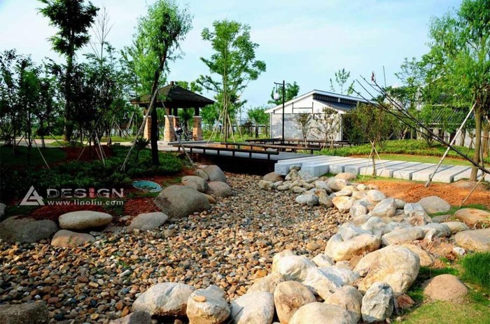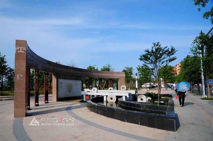 軸線內(nèi)穿插了“山之園、水之園、銅之園、道之園”四大主題園。一個是具有現(xiàn)代空間形式的“現(xiàn)代景觀軸”,這兩個傳統(tǒng)與現(xiàn)代軸線交織對比,達(dá)到傳統(tǒng)和現(xiàn)代的融合與統(tǒng)一。環(huán)繞全園的步行道為交通主框架,蜿蜒的步道與旱溪(圖