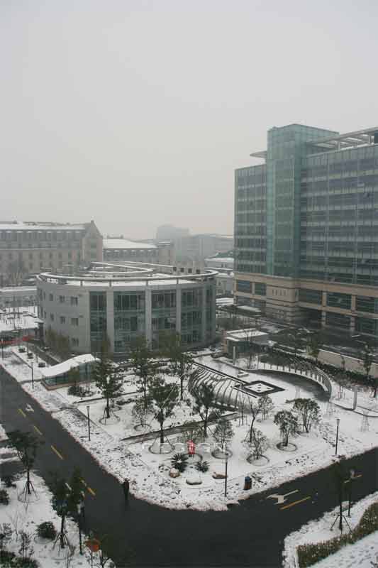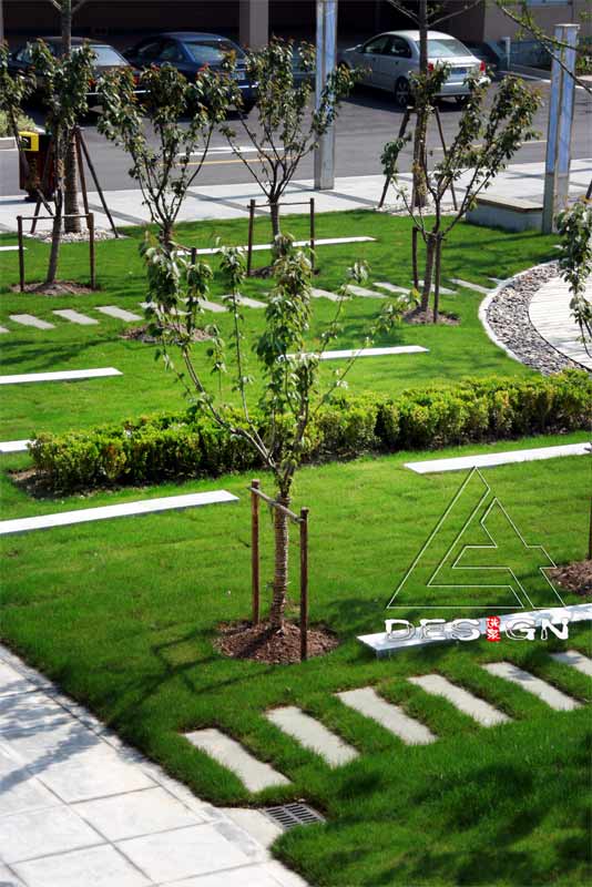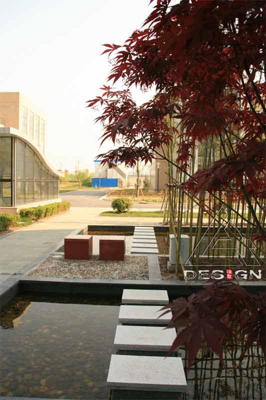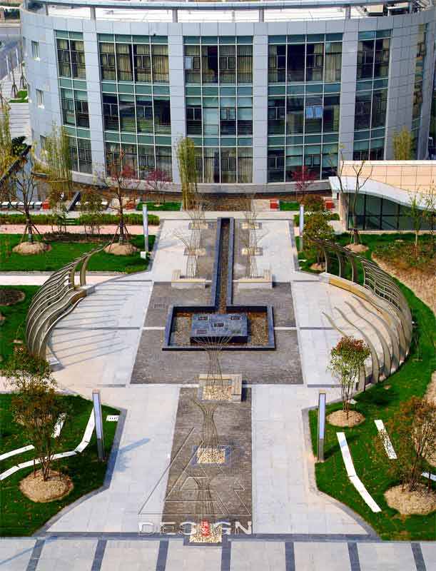 The project carried out formerly is a first-stage comprehensive matched service base which faces roads externally. An L-shaped main office building divides the space into an eastern part and a western part; the main entrance landscape space in the east and the roof garden landscape space of the underground garage in the west. For ensuring the integrity of the space, space is related by continuous water with variable forms and black and white pavements, while small spaces are alternated in the space by the landscape elements, such as plants, micro-landforms and small arch bridges, curves and a circular composition method to create order and activity within the environment.
