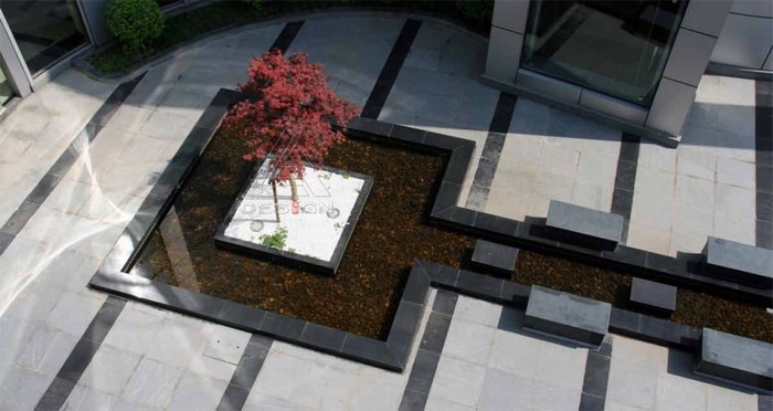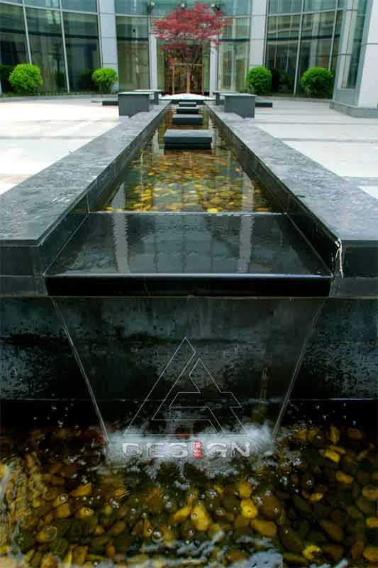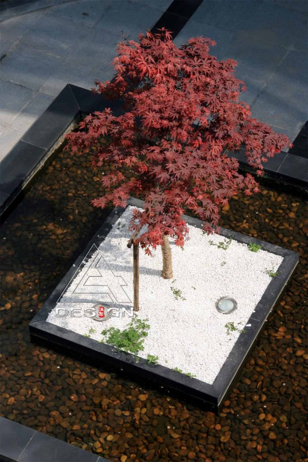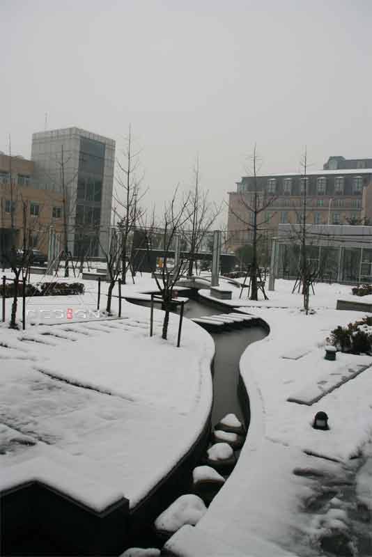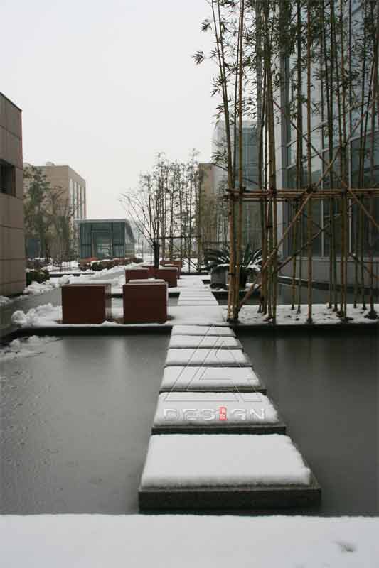 該項(xiàng)目在有限的空間環(huán)境中通過各種造園手法——入口成排的剛竹、弧形的景墻、蜿蜒的小溪、筆直的水槽、錯(cuò)落的跌水、精致的小橋、方圓組合的綠地與休閑平臺(tái)等,形成了既有開放的動(dòng)空間,又有內(nèi)聚的靜空間,使整體環(huán)境在融入周圍現(xiàn)代建筑的同時(shí)又有傳統(tǒng)的意境之美。