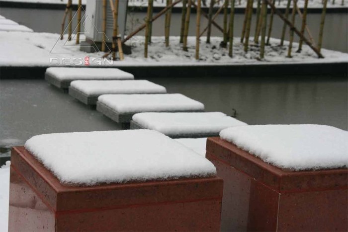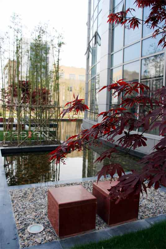 planted, which suggests elegance and tranquillity. Ting-steps built in water, planting pools and rest platforms extending towards to water and small red square stools on the recreation platforms provide a small flexible space, so you can sit close by a window of office to enjoy the peaceful moment lonely of the afternoon. The breeze passes through the bamboo forest to blow small wavelets beside the pebbles. Because of the water, the space is parted but not separated; voices keep a distance while people converse and walk outside the window, and fish move freely in water, so the site has natural delight at that moment.