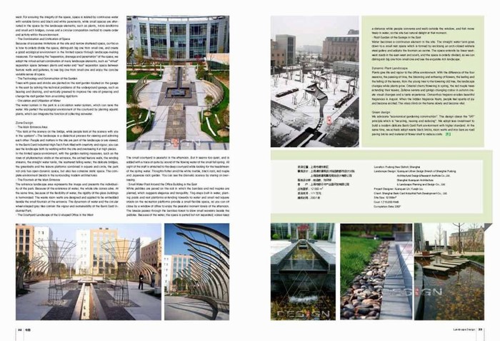 You look at the scenery on the bridge, while people look at the scenery with you in the upstairs”—The landscape is a dialectical process for viewing and admiring each other. People and matters in the site are part of the landscape or are viewed. In the Bank Card Industrial High-Tech Park filled with creativity and vigour, you can see the landscape both by walking within the site and overseeing it at high places. In the limited space environment, with the garden-making measures, such as the rows of phyllostachys viridis at the entrance, the arched feature walls, the winding streams, the straight water tanks, the scattered falling water, the delicate bridges, the greenbelts and the leisure platforms combined in square and circle, the park not only has open dynamic space, but also has cohesive static space. The complete environment blends in the surrounding modern architectures.