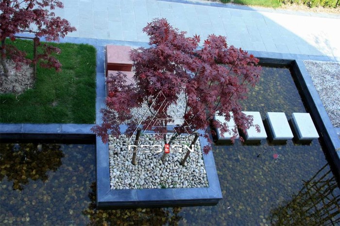 白卵石上的竹子與紅楓浸透著幾分寧?kù)o與典雅;涉水而建的石汀步以及向水中延伸的種植池、休憩平臺(tái)及其上面的紅色方凳豐富了小空間的多樣性,人們坐在辦公室的窗邊,獨(dú)享這午后的寧?kù)o。微風(fēng)穿過竹林,拂起卵石邊的水波,因?yàn)樗?,空間變得“隔”而不分; 窗外行走,交談的聲音變得若即若離,水里的魚兒在自由游弋,這里此刻多了幾分自然情趣。